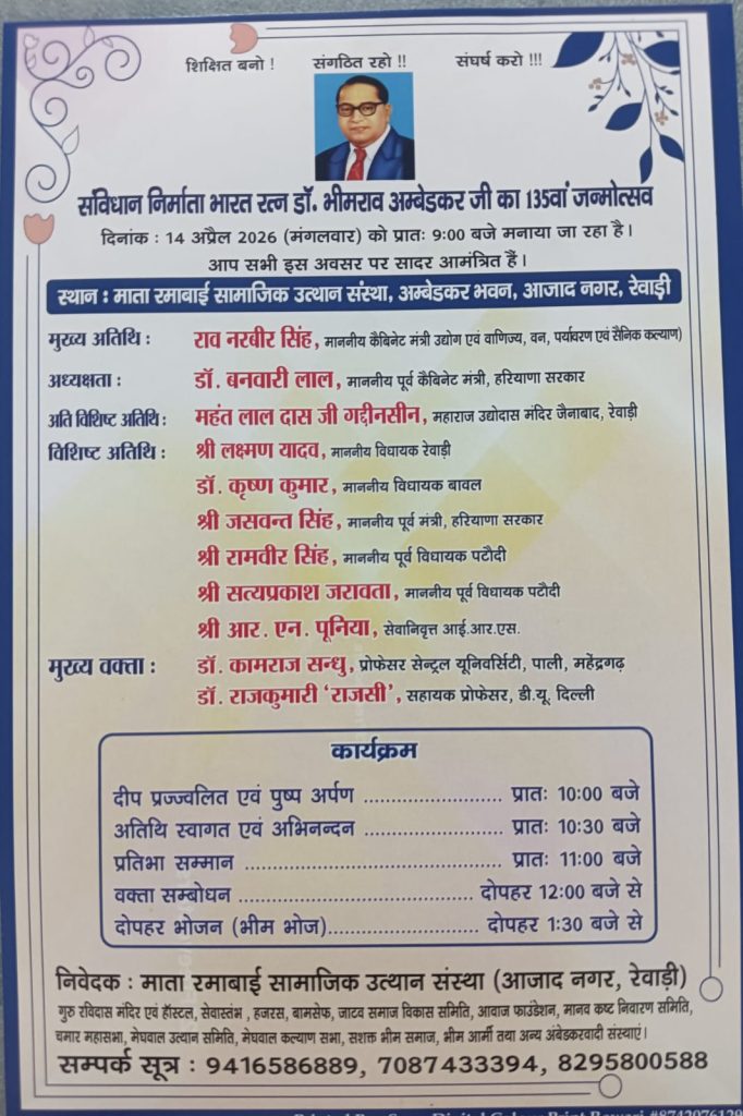 रेवाड़ी 10 अप्रैल l माता रमाबाई सामाजिक उत्थान संस्था के तद्भावधान में आगामी 14 अप्रैल को अंबेडकर जयंती पर प्रदेश सरकार के वन, पर्यावरण एवं उद्योग मंत्री राव नरबीर सिंह मुख्य अतिथि के तौर पर रेवाड़ी पधारेंगे। रेवाड़ी के आजाद नगर स्थित अंबेडकर भवन में होने वाले इस कार्यक्रम की अध्यक्षता पूर्व मंत्री डॉ बनवारी लाल करेंगे। उक्त जानकारी देते हुए मंत्री के निजी प्रवक्ता हरिन्द्र सिंह यादव ने बताया कि इस आयोजन में रेवाड़ी के विधायक लक्ष्मण सिंह यादव व बावल के विधायक डॉक्टर कृष्ण कुमार के अलावा पूर्व मंत्री जसवंत सिंह, पूर्व विधायक रामवीर सिंह पूर्व विधायक सत्य प्रकाश जरावता, पूर्व आईएएस आरएन पूनिया, डॉ कामराज संधु तथा डॉ. राजकुमारी राजसी विशिष्ट अतिथि होंगे। इस अवसर पर प्रतिभा प्रोत्साहन समारोह मुख्य कार्यक्रम रहेगा।
